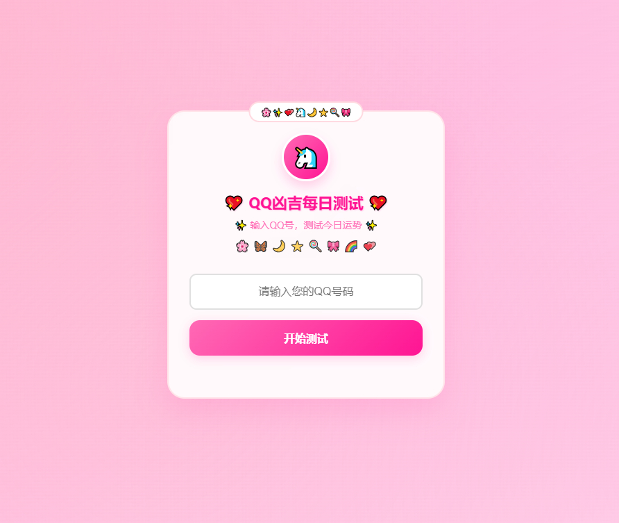 这是一个超级可爱的QQ每日运势测试网页应用,采用梦幻粉白色系设计