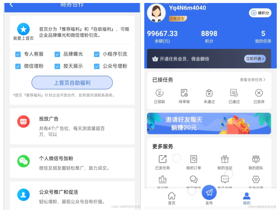 任务管理:包含平台的任务列表和用户任务列表,以及任务订单的相关管理。
