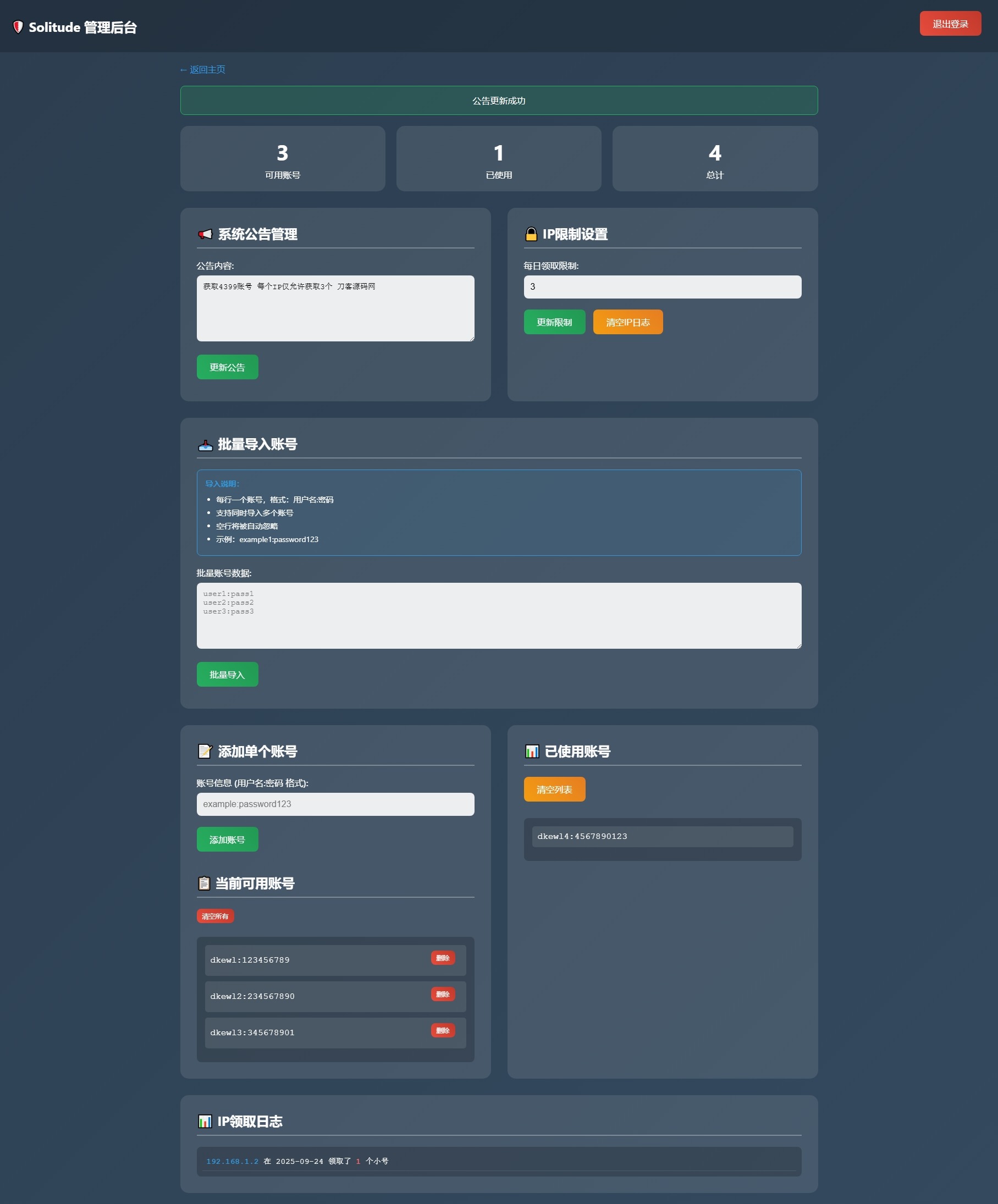 此为小号分发卡密系统源码,专用于分发小号库存账号或卡密等使用,不过规定每个IP仅能领取3次,也可视作小号分发工具。