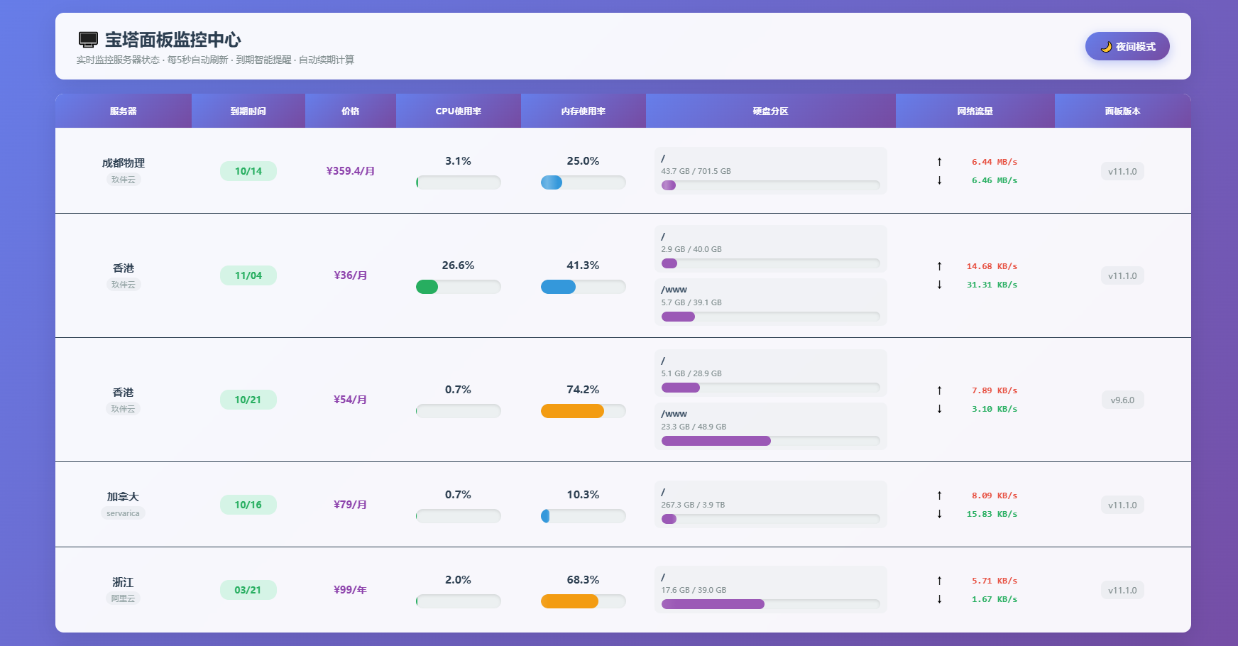 AI编写的一个服务器监控源码 发布时间:2025-11-07 00:42:47 酷客源码 1浏览 介绍 AI编写的一个服务器监控源码 接口使用的宝塔面板api,被监控机器需要安装宝塔面板 将压缩包上传至站点解压,修改“servers.php”内链接信息即可 图片 下载地址 资源下载 资源展示 MirageV资讯类个人博客主题源码/WordPress主题/全开源 IP定位系统源码 二开版 新增分销功能 Phemex多语言交易所源码/期权交易+合约交易+新币申购+锁仓挖矿+平台币发行+K线行情控制/前端uniapp编译后+后端PHP 完整运营版任务悬赏系统源码/众人帮任务平台/VUE源码/支持对接API 新UI网站维护通知公告界面HTML源码 2版 全新AI工具小程序源码 全开源 其它推荐 最新多语言跨境商城系统源码 跨境电商系统 全开源 多盘资源搜索转存系统源码v3.6 全开源版 梦幻域名防红COS系统源码 带后台 全开源 抖音很火的多弹窗系统源码 多用户版 附教程 智能网速在线测试网站源码_宽带网速检测 赞助打赏单页HTML源码 APP软件介绍下载单页源码 双端自适应 最新高仿百度网盘奇妙赏盲盒源码/Uniapp前端/易支付对接/无限回调/1:1完美复刻UI